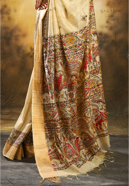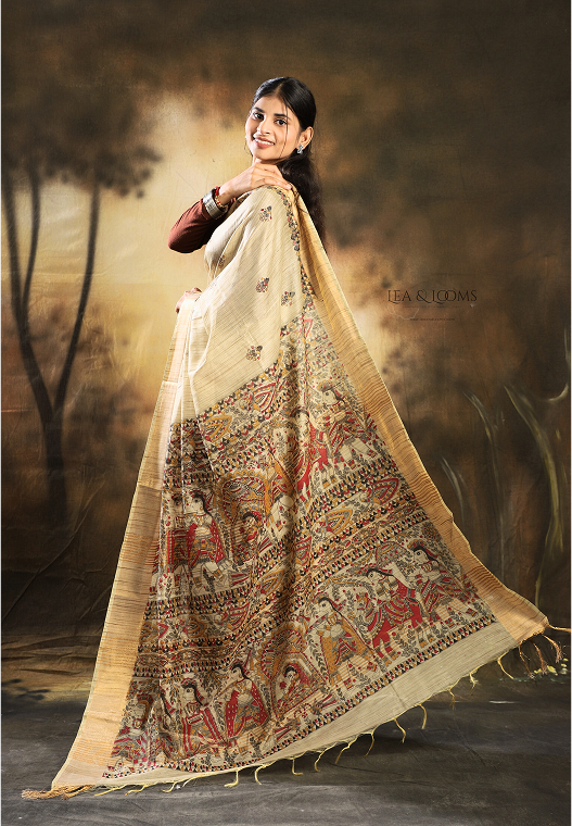 Celebrate the beauty of heritage with Madhurya, a handcrafted masterpiece that blends the intricate charm of traditional Madhubani hand block printing with the refined elegance of art silk and linen. Each drape is a poetic canvas, narrating stories from the heart of Mithila, brought to life by skilled artisans.