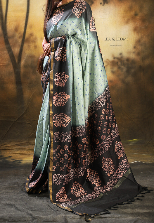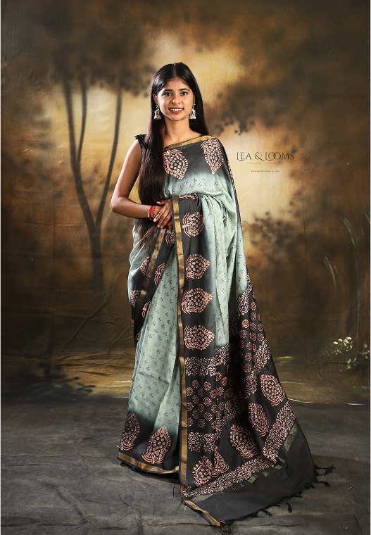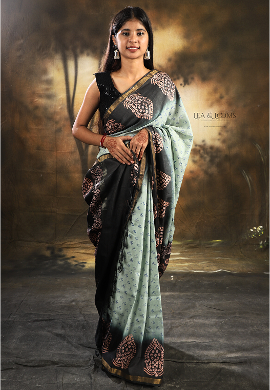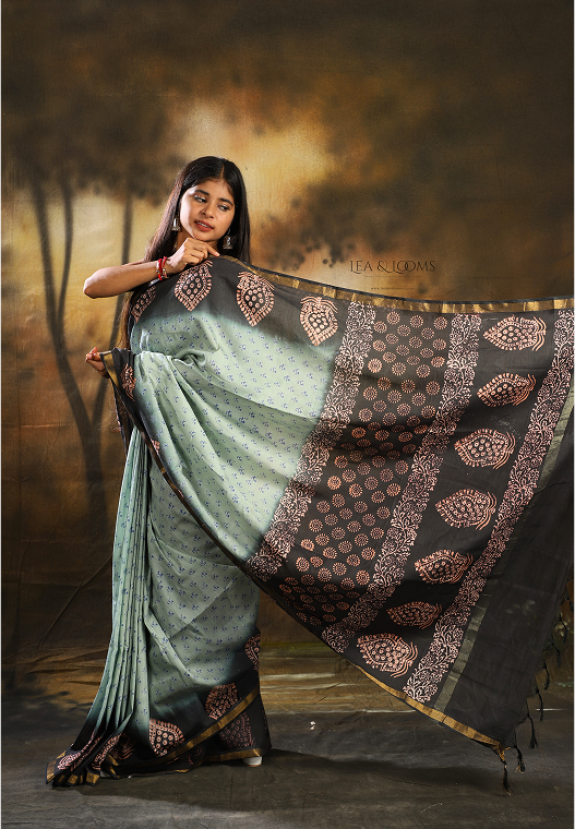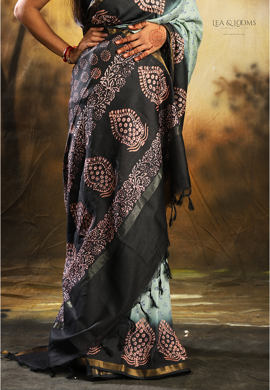 Experience the graceful charm of Myra, a luxurious pure Kattan silk saree that beautifully blends heritage craftsmanship with timeless elegance. Meticulously block printed by hand, each motif tells a story of tradition, precision, and artistry.